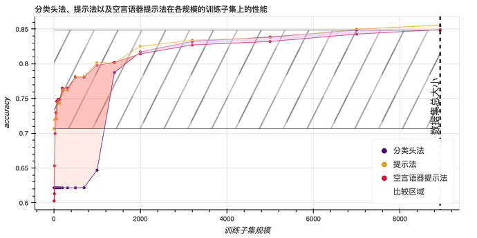 数据点(data points)通常用于描述单个信息单位或观测值,在本文中,它被用来量化“提示词”方法相对于传统方法的效率和效果。文章比较了两种训练(微调)机器学习模型的方法:一种是使用提示 (prompts),本文也称之“提示词”,另一种是使用传统的分类器头 (classifier heads),本文也称之为“分类头”。通过比较可以发现,使用提示词的方法通常比使用分类器头的方法更好。