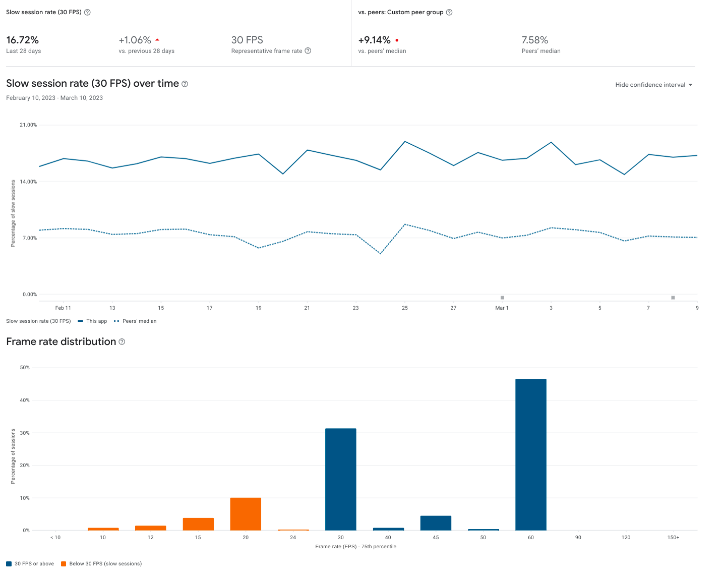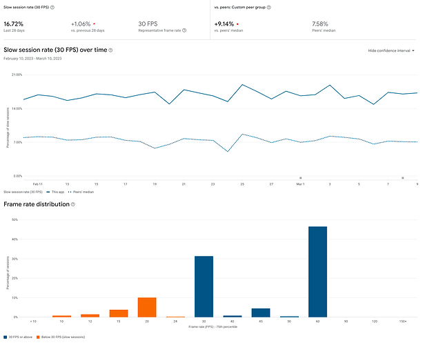 △ Play 管理中心的 Android Vitals 目前提供帧率指标,可帮助您了解玩家对您游戏流畅度的感受。