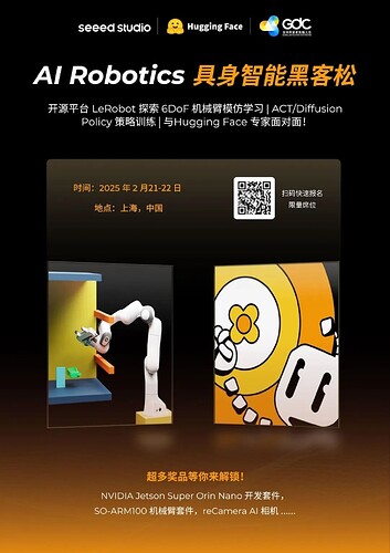 欢迎来到 Physical AI 的最前沿!Seeed x LeRobot 具身智能黑客松现邀请所有对在机器人领域训练模仿学习策略,并实时进行推理部署感兴趣的人,共同创造具有影响力的创新解决方案。在这里,你可以与志同道合的开发者一起实践前沿机器人技术,获取免费硬件支持和独家资源,并快速在真实机器人系统中验证你的想法!