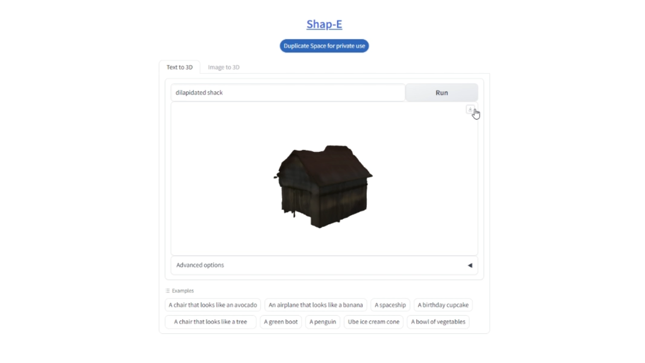 输入 “Dilapidated Shack” 作为你的提示并点击 ‘Generate’。当你对模型满意时,下载它以进行下一步。