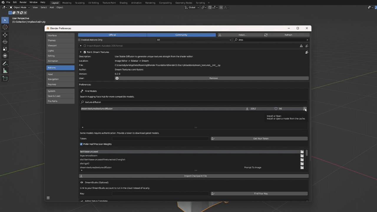 为了给我们的模型添加纹理,我们将使用 Dream Textures,这是一个用于 Blender 的稳定扩散纹理生成器。按照 官方仓库 上的说明下载并安装插件。