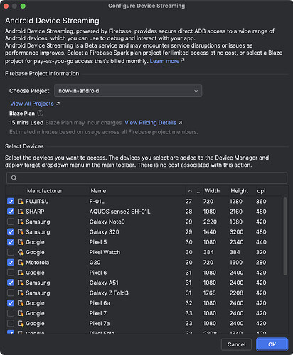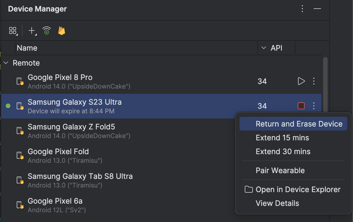 我们非常高兴您和您的团队试用由 Firebase 提供支持的 Android 设备流式传输功能。我们认为,这是一种简单且经济实惠的方式,便于您根据需要直接从 IDE 访问所需的设备,从而确保为用户提供出色的应用质量和功能。