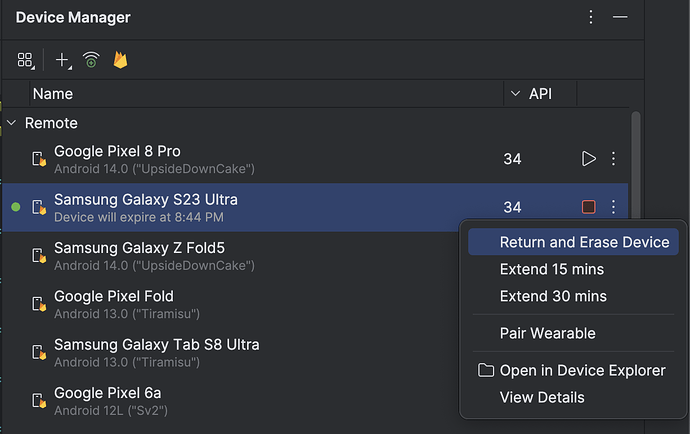 近期,Android 设备流式传输功能推出 Beta 版,Android 开发者们现可在 Android Studio Jellyfish 或更高版本中使用。我们还在目录中添加了新设备,并推出了灵活的定价方案,让您低成本访问最新的 Android 设备。
