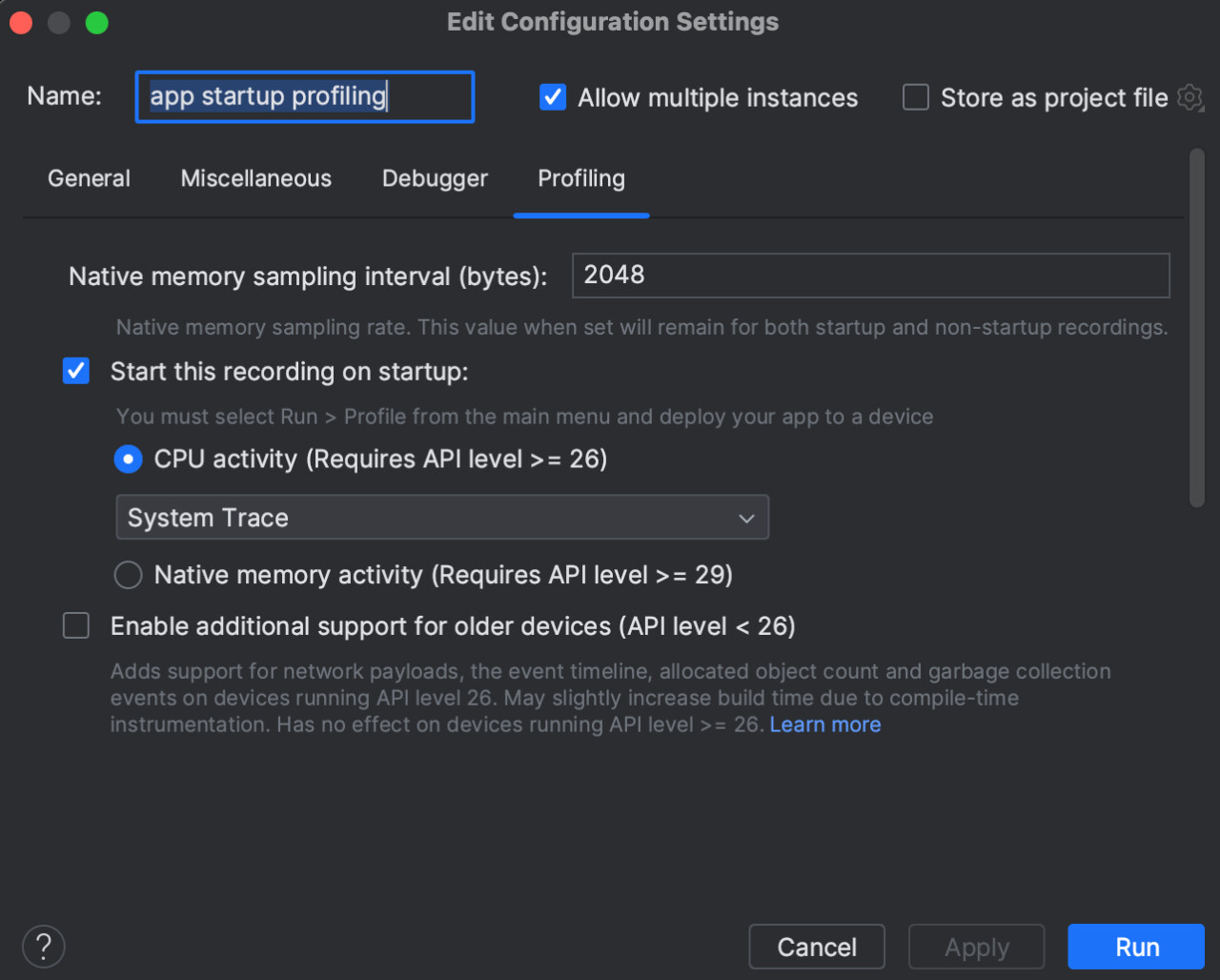 然后,选择 “Profiling” (分析) 选项卡,并确保选择 “Start this recording on startup” (启动时开始进行记录) 以及 “CPU Activity” (CPU 活动) > “System Trace” (系统跟踪) 并点击 “Apply” (应用)。