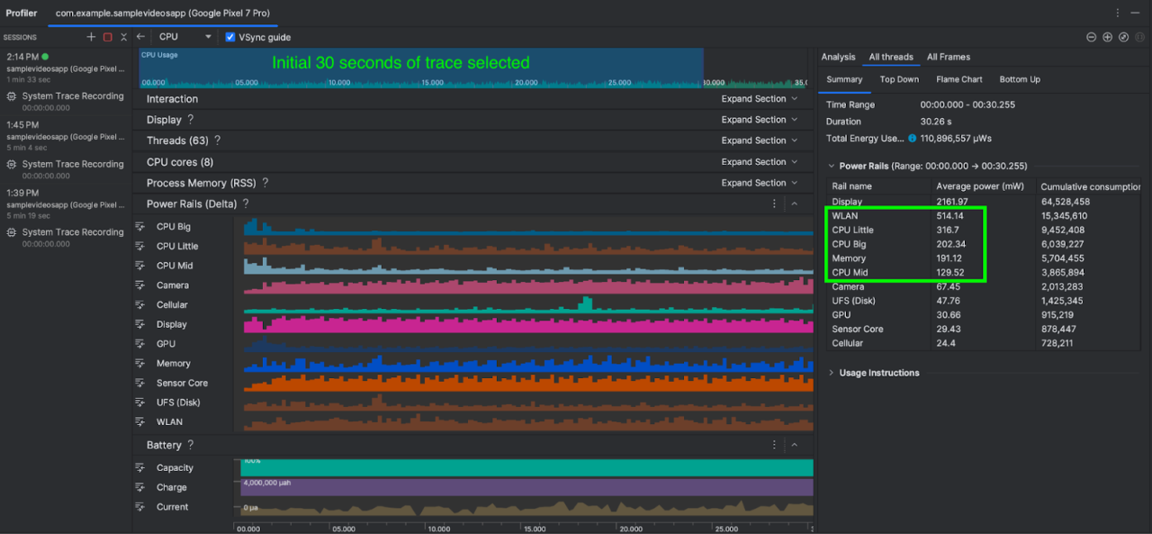 在此场景中,我们在运行应用时播放画质较低的视频,并测量前 30 秒的功耗。与之前一样,我们也可以选择多次运行场景 B,并取功耗平均数。同样,Android Studio 中显示系统跟踪标记后,在时间轴选择面板中选择 0 - 30 秒的时间范围。