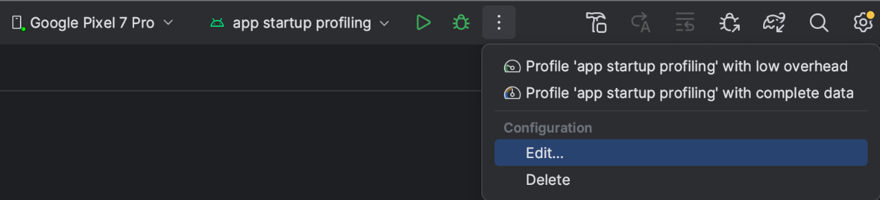 现在,每当您想从头运行此应用并将 CPU 性能分析器附加到应用上时,只需运行 “Profile app startup profiling with low overhead” (低开销的应用启动分析) 即可。
