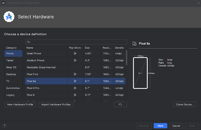 Android 模拟器 (35.1 及以上版本) 稳定版现已支持 Pixel 8a。您无需使用实体设备即可在更多 Pixel 设备上测试应用。在创建新的虚拟设备时,您可以在手机类别中找到新的 Pixel 8a。此外,您可以在 Android Studio 的 Canary 版本中找到 Pixel 9 设备。