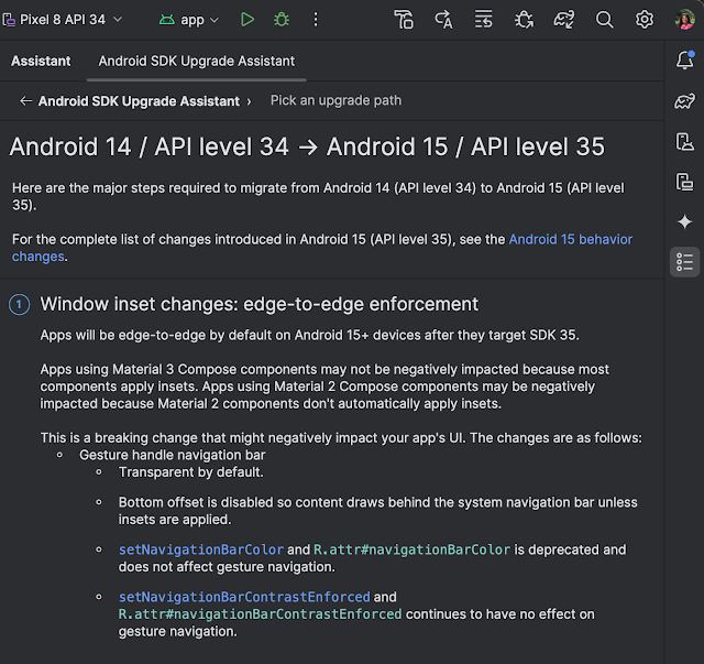 Android SDK 升级助手 提供了分步向导工具,可帮助您升级 targetSdkVersion。升级助手还将文档直接整合到 Android Studio 中,节省您的时间和精力。Android Studio Koala Feature Drop 增加了对将项目升级到 Android 15 (API 级别 35) 的支持。