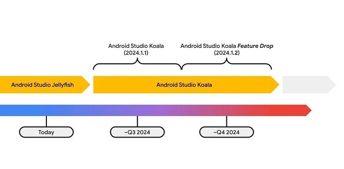 很快,我们将推出最新的 Canary 版本 Android Studio Koala Feature Drop (2024.1.2),这是基于 IntelliJ IDEA 2024.1 的第二个版本。这标志着优化后的开发周期的开始每一个动物代号将会涵盖两个主要的 Studio 版本发布:首先是平台更新,随后是功能更新。