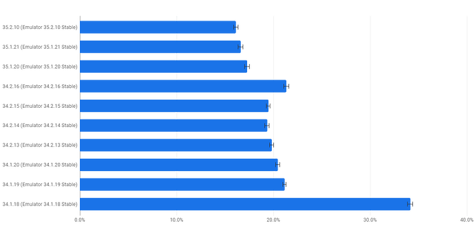 此图表展示了 Android 模拟器稳定版本所报告崩溃情况的减少 (新版本位于顶部,条形越短表示效果越好)。