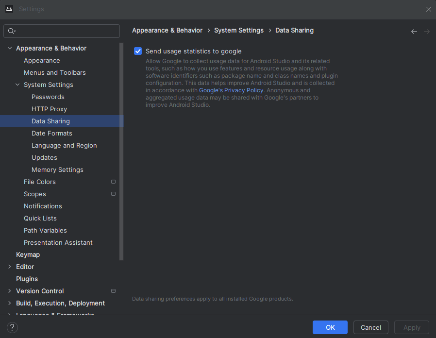 您可以通过以下方式选择加入:前往 “设置 (Settings)”—“外观和行为 (Appearance and Behavior)”—“系统设置 (System Settings)”—“数据共享 (Data Sharing)”,然后勾选 “向 Google 发送使用情况统计信息 (Send usage statistics to Google)”。