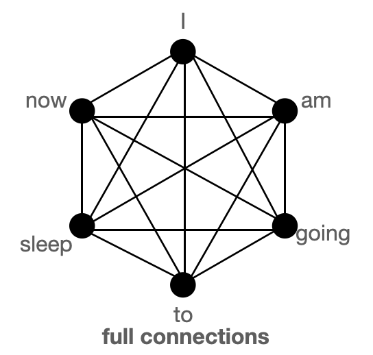 完全注意力: 模型可以直接在单个层中将信息从一个词元传输到另一个词元,因为每个词元都会对每个其他词元进行查询,并且受到其他每个词元的关注。我们考虑一个与上图类似的例子,如果模型需要将 ‘going’ 与 ‘now’ 关联起来,它可以简单地在单层中执行此操作,因为它们两个是有直接连接的。