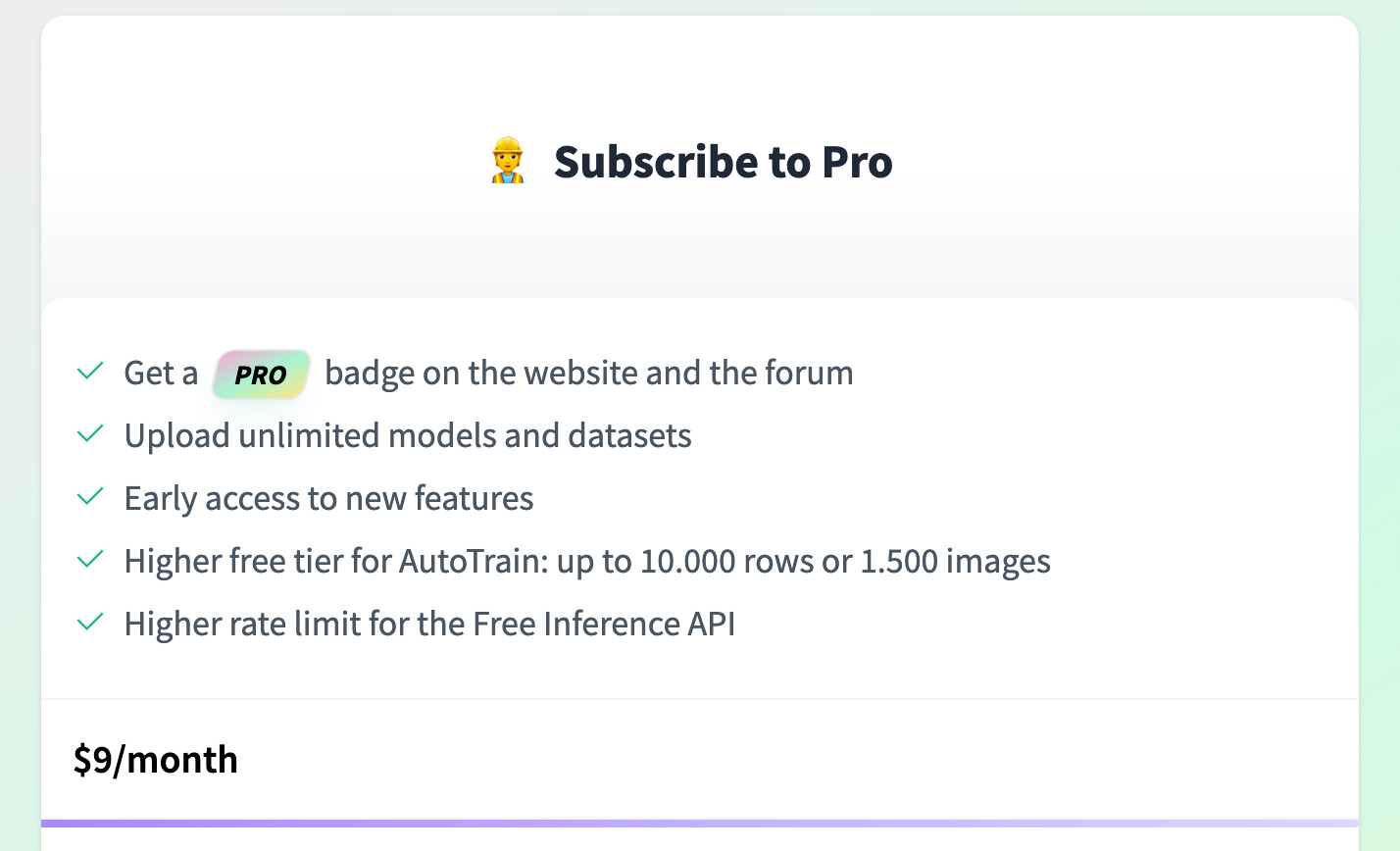 我们为 Hugging Face Pro 订阅用户加入了一些新的模型 API 访问权限包括 Llama 2 Chat、Code Llama Base 和 Stable Diffusion XL 等,同时也提高了对推理 API 的速率限制。开发者们可以更好地进行模型实验和原型开发,而无需部署模型到自己的基础设施上。
