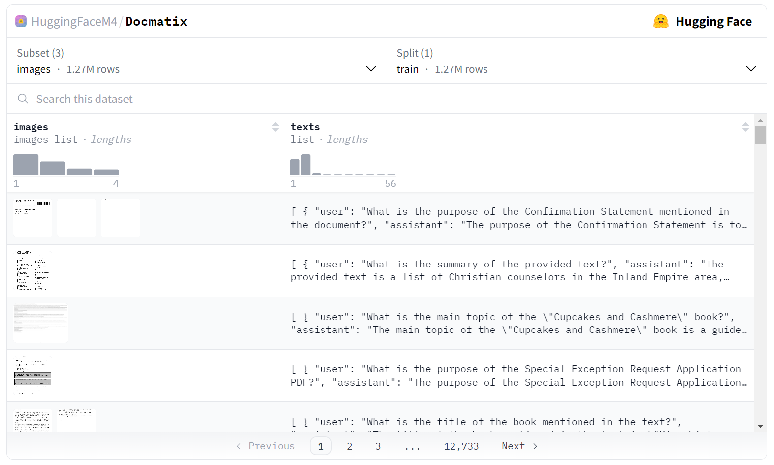 为了解决这一问题,我们很高兴推出 Docmatix,这是一个 DocVQA 数据集,包含 240 万张图像以及源自 130 万个 PDF 文档的 950 万对问答。与之前的数据集相比,规模扩大了 240 倍。