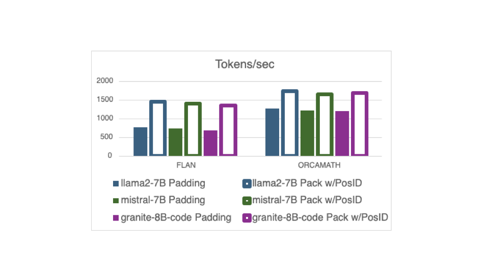 OrcaMath 数据集的示例较长,且示例长度差异较小。因此,从打包中获得的改进较低。我们的实验显示,在使用这种打包方式在 OrcaMath 数据集上训练时,这三个模型的吞吐量增加了 1.4 倍。