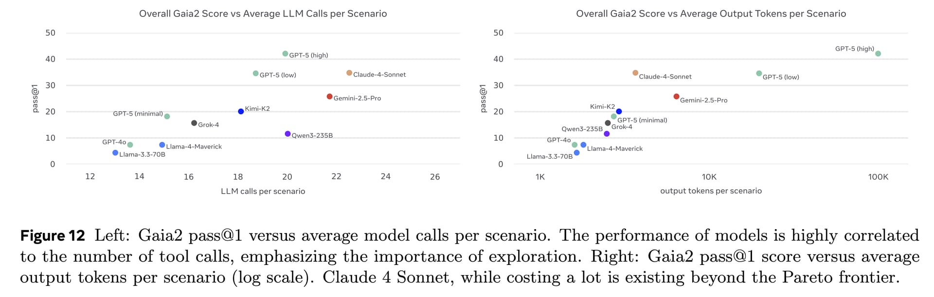 因此,我们对得分进行了成本归一化:通过平均 LLM 调用次数与输出 token 数量来量化,并绘制出性能—成本的帕累托前沿(Pareto frontier)。在论文中,你将看到模型得分与实际金钱成本及耗时的对比结果。