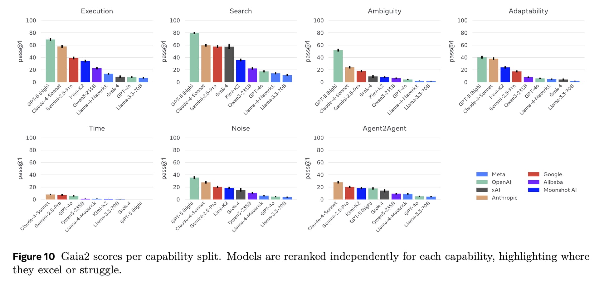 从能力维度来看,一些任务已经被顶级模型基本解决:例如简单工具调用与指令执行(execution),以及整体的检索能力(search)(这一点从 GAIA 的结果中已经有所预期)。然而,歧义处理(ambiguity)、适应性(adaptability)和抗噪性(noise)依旧是所有模型的普遍挑战。值得注意的是,那些过去被认为复杂的智能体任务(如指令执行与信息检索),并不能很好预测模型在更贴近真实世界任务上的表现。最后,目前所有模型在 time 维度上的表现最为薄弱:在处理时间敏感型操作上仍然非常困难(不过,未来通过专用工具与更好的时间推理机制可能有所改善)。详细分析可见论文正文。