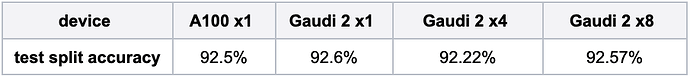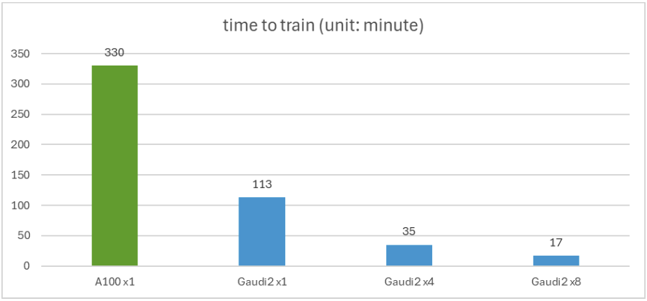 下图显示了微调所用的时间。可以看到,单张 Gaudi 2 比单张 A100 快 2.92 倍。该图还表明,在 4 张或 8 张 Gaudi 2 加速卡上使用分布式训练可以实现近线性扩展。