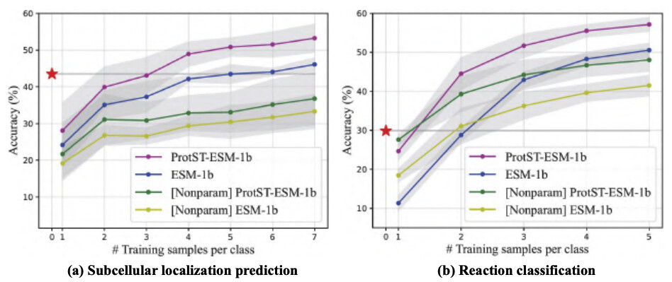 PLM 最常见的任务之一是预测氨基酸序列的亚细胞位置。此时,用户输入一个氨基酸序列给模型,模型会输出一个标签,以指示该序列所处的亚细胞位置。论文表明,ProtST-ESM-1b 的零样本亚细胞定位性能优于最先进的少样本分类器 (如下图)。