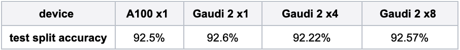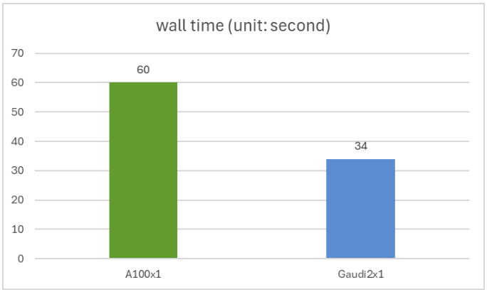 你可以使用 此脚本 重现我们的实验,我们以 bfloat16 精度和 batch size 1 运行模型。在英伟达 A100 和英特尔 Gaudi 2 上,我们获得了相同的准确率 (0.44),但 Gaudi 2 的推理速度比 A100 快 1.76 倍。单张 A100 和单张 Gaudi 2 的运行时间如下图所示。