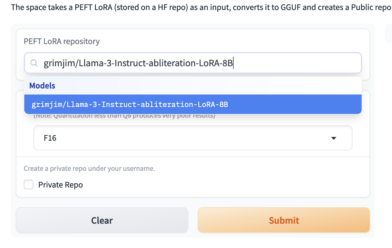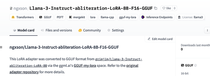 以下是一个已转换的 GGUF LoRA 适配器示例:ngxson/Llama-3-Instruct-abliteration-LoRA-8B-F16-GGUF
