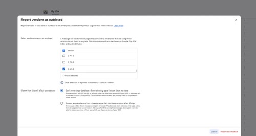 SDK 提供方还可以鼓励应用开发者升级到更新的 SDK 版本,或提供关于特定 SDK 版本的指导。借助 SDK 管理中心,SDK 提供方可以 在其版本中添加备注,报告版本已过时;对于非常旧且使用率较低的 SDK 版本,应用开发者有 90 天的时间可以进行更新,之后他们将无法继续发布使用该版 SDK 的新应用版本。