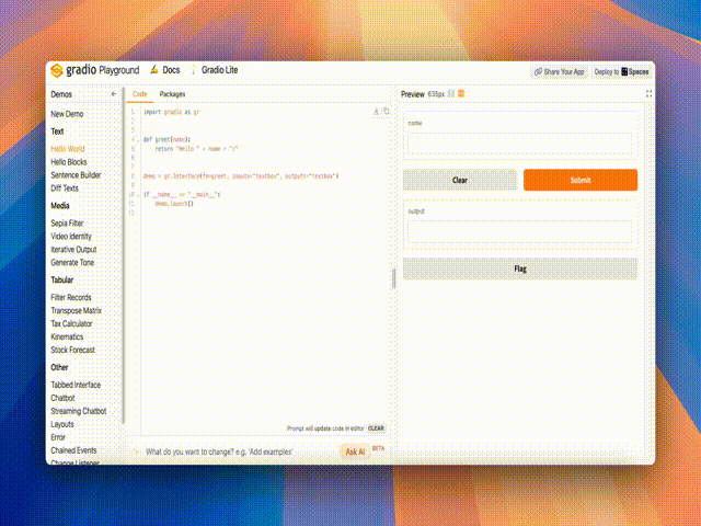 “LLM 不了解 Gradio” → Gradio 5 推出了一个实验性的 AI Playground,你可以在其中使用 AI 来生成或修改 Gradio 应用,并立即在浏览器中预览:https://www.gradio.app/playground
