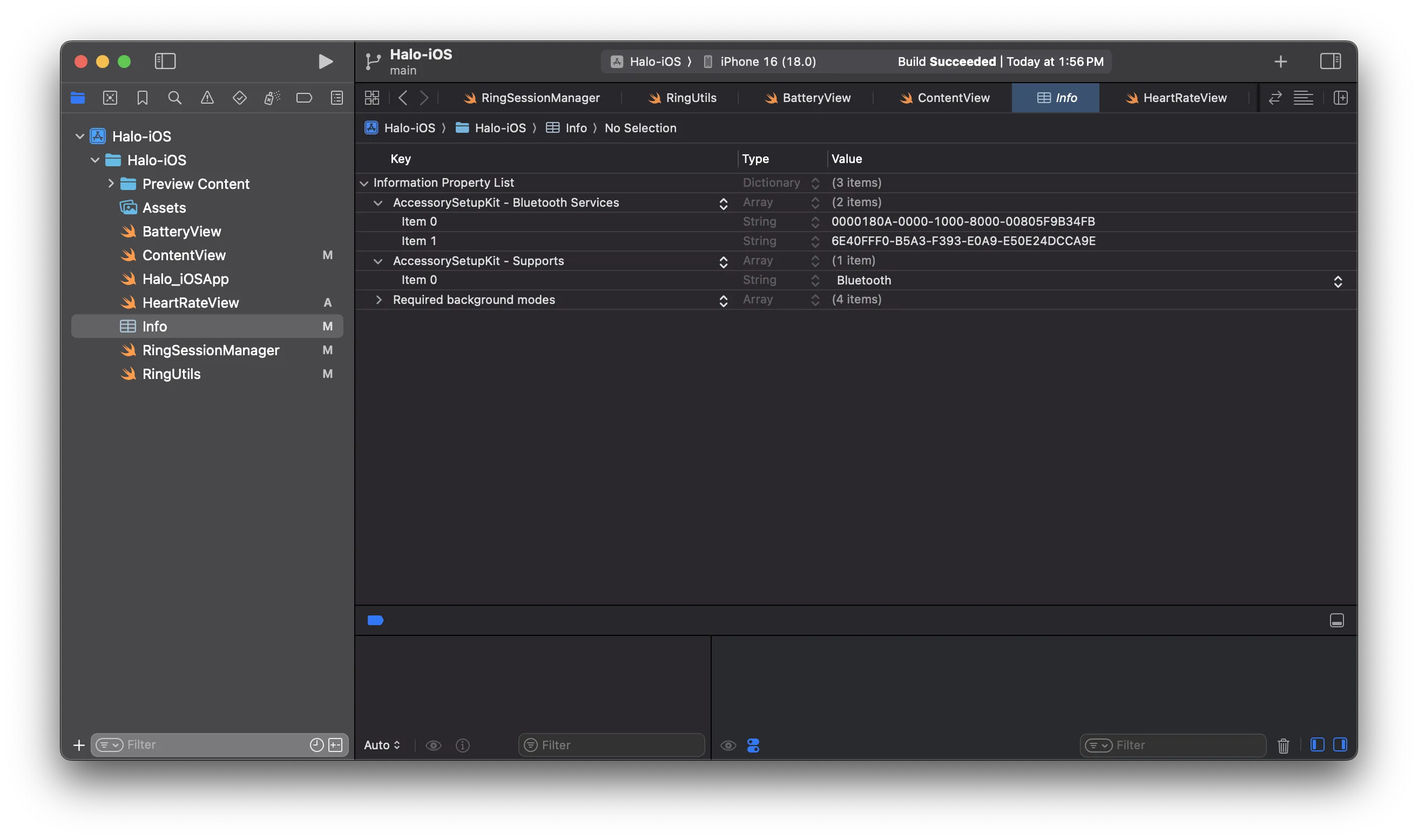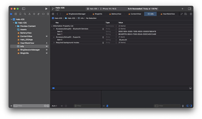 打开 Info.plist 文件(可以在左侧边栏中找到,或通过 Project Navigator (⌘1) > Your Target > Info 定位)。添加以下键值条目以支持与 COLMI R02 戒指的配对: