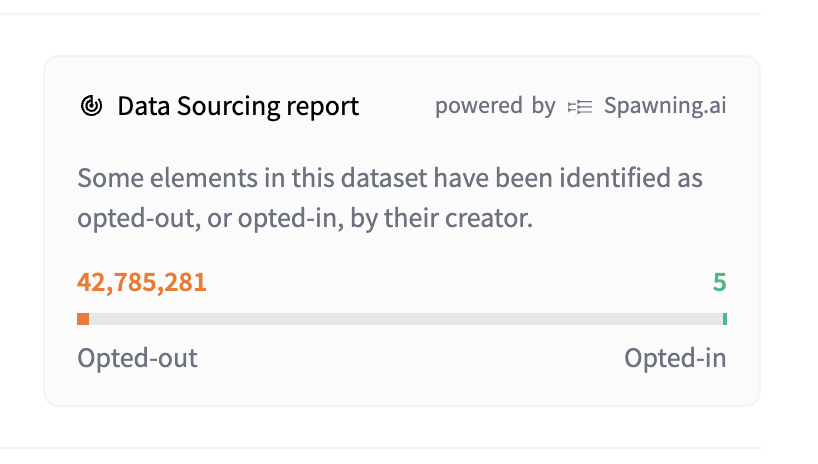 在构建商业模型时,使用授权的训练数据至关重要,Spawning.ai 提供了一个 API 来确保你的机器学习项目建立在同意的数据之上。部分符合条件的、在 Hugging Face 上开源托管的数据集也将由 Spawning.ai 提供的 API 来显示数据源的报告。
