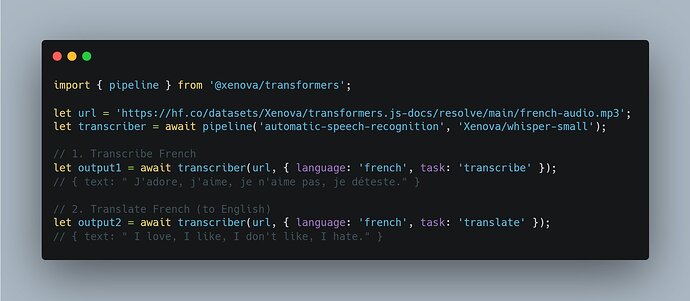 作为 Transformers.js v2.2.0 的示例应用,我们发布了一个名为 Whisper Web 的网页应用,它支持了 100 多种不同语言的转录和翻译,并支持切换模型、语言和任务。其代码是开源的,只需要几行代码即可运行。