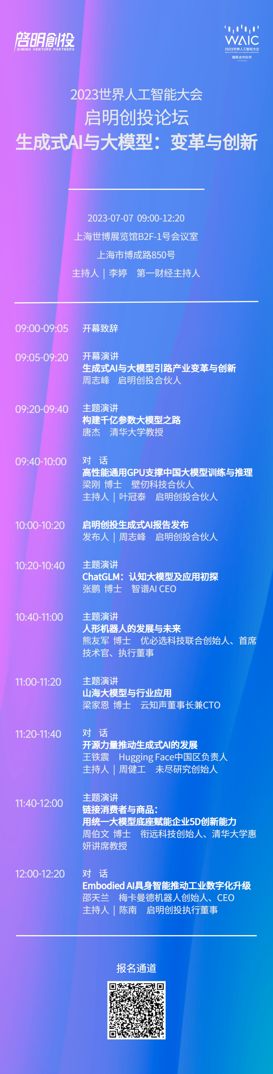 我们也将出席和参与 2023 年 7 月 7 日 9:00-12:00 在世博展览馆 B2F-1 号会议室的「启明创投论坛:生成式 AI 与大模型」的圆桌讨论环节。