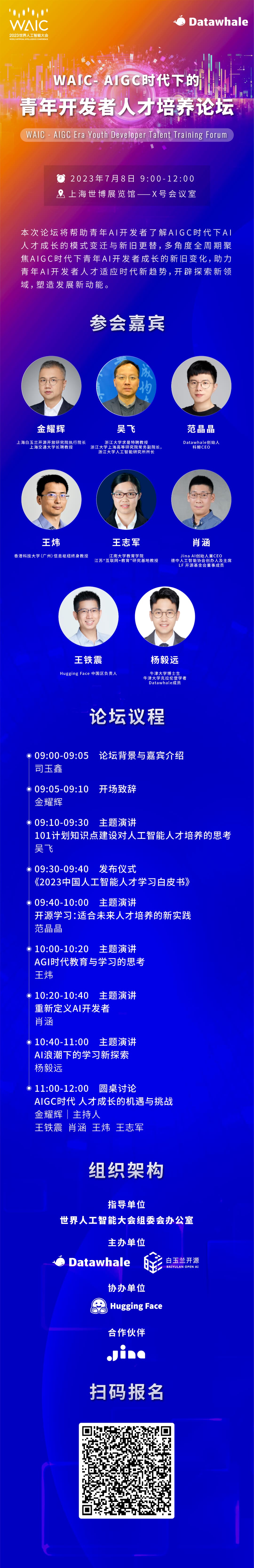 欢迎来参加由 Hugging Face 中国负责人 Tiezhen 出席的 WAIC - AIGC 时代下的青年开发者人才培养论坛,2023 年 7 月 8 日 9:00-12:00,在上海世博展览馆 - X 号会议室,请查看活动海报和报名链接。