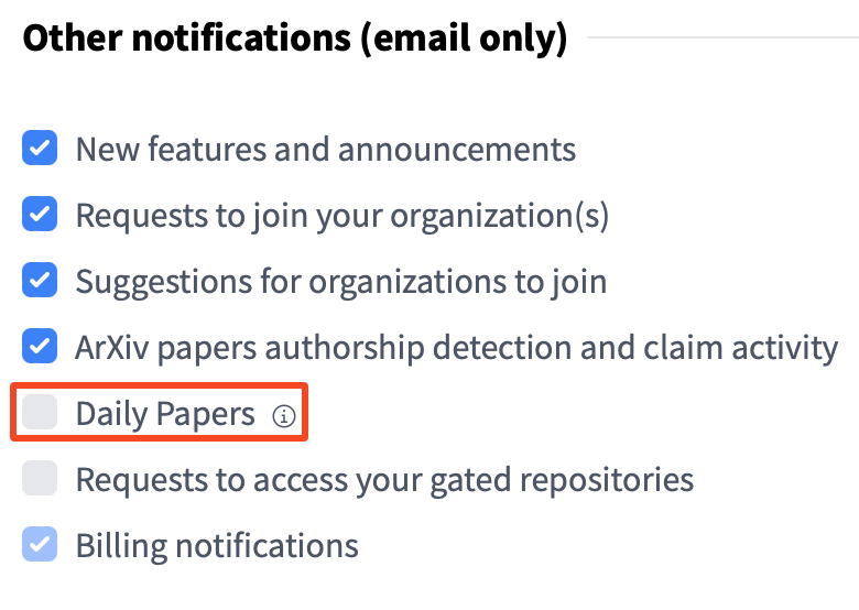 小伙伴们现在可以在 Hugging Face 上设置获取有关每日新论文的通知。点击链接,选择左侧的「通知设置」,勾选「每日论文」即可。