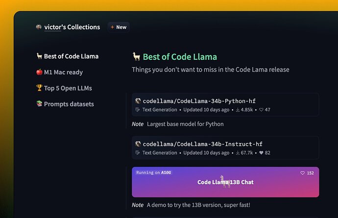 现在你可以把任何你喜欢的模型 / 数据集 / Space 应用等按照自己的喜好进行分类整理和收藏。这个功能不仅对个人账号开放,同时对 Hub 上的组织账号也同样开放,Collection 会显示在个人或者组织的资料页面上,快去试试看吧!