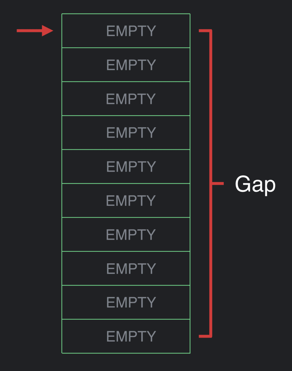 间隙缓冲区是一个含有当前索引或游标的集合,它在内存中使用扁平数组 (flat array) 实现。这一扁平数组比它代表的数据集合要大,而那些没有使用的空间就被称为间隙。