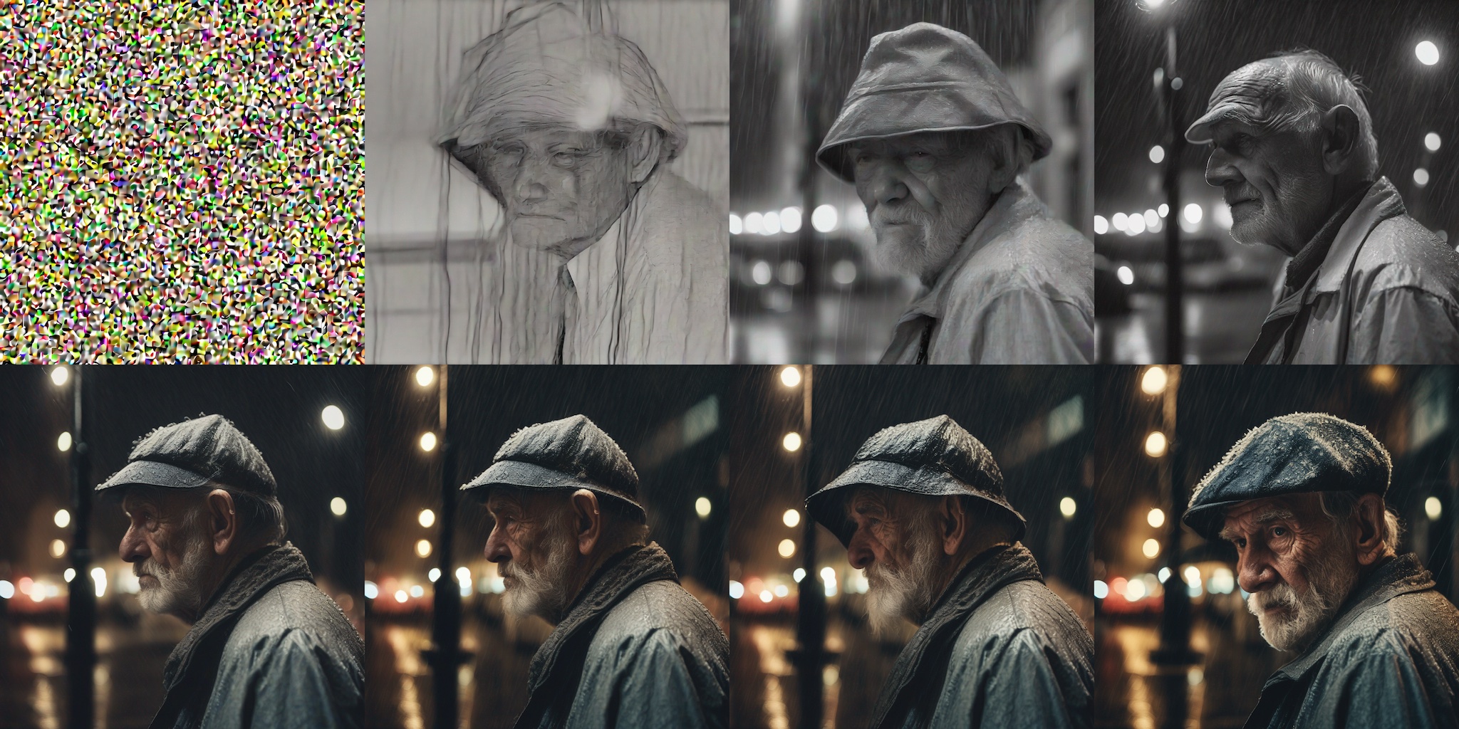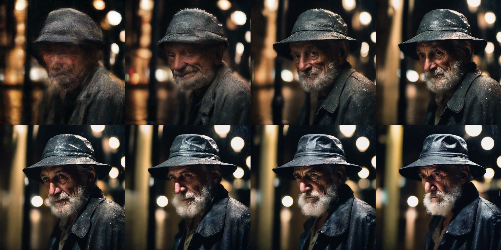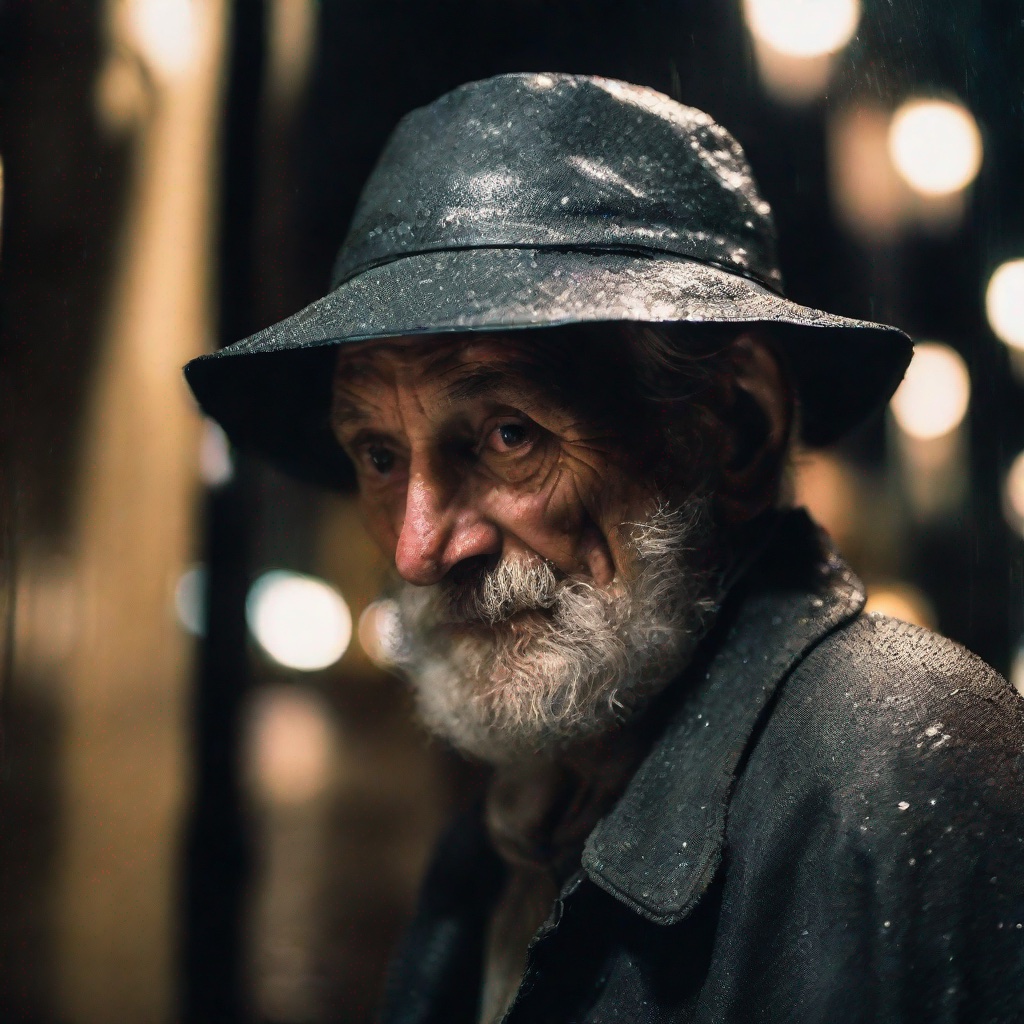 prompt = "close-up photography of old man standing in the rain at night, in a street lit by lamps, leica 35mm summilux"