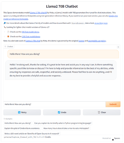 你可以通过 这个空间 或下面的应用轻松试用 Llama 2 大模型 (700 亿参数!):