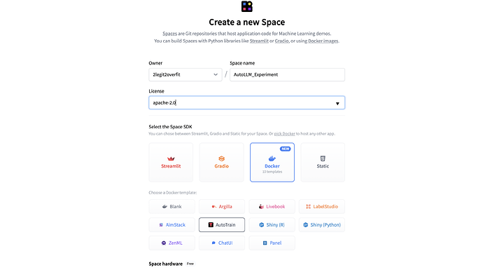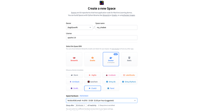 后面,我们将部署两个来自 Spaces、AutoTrain 和 ChatUI 的预配置 docker 应用模板。