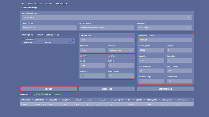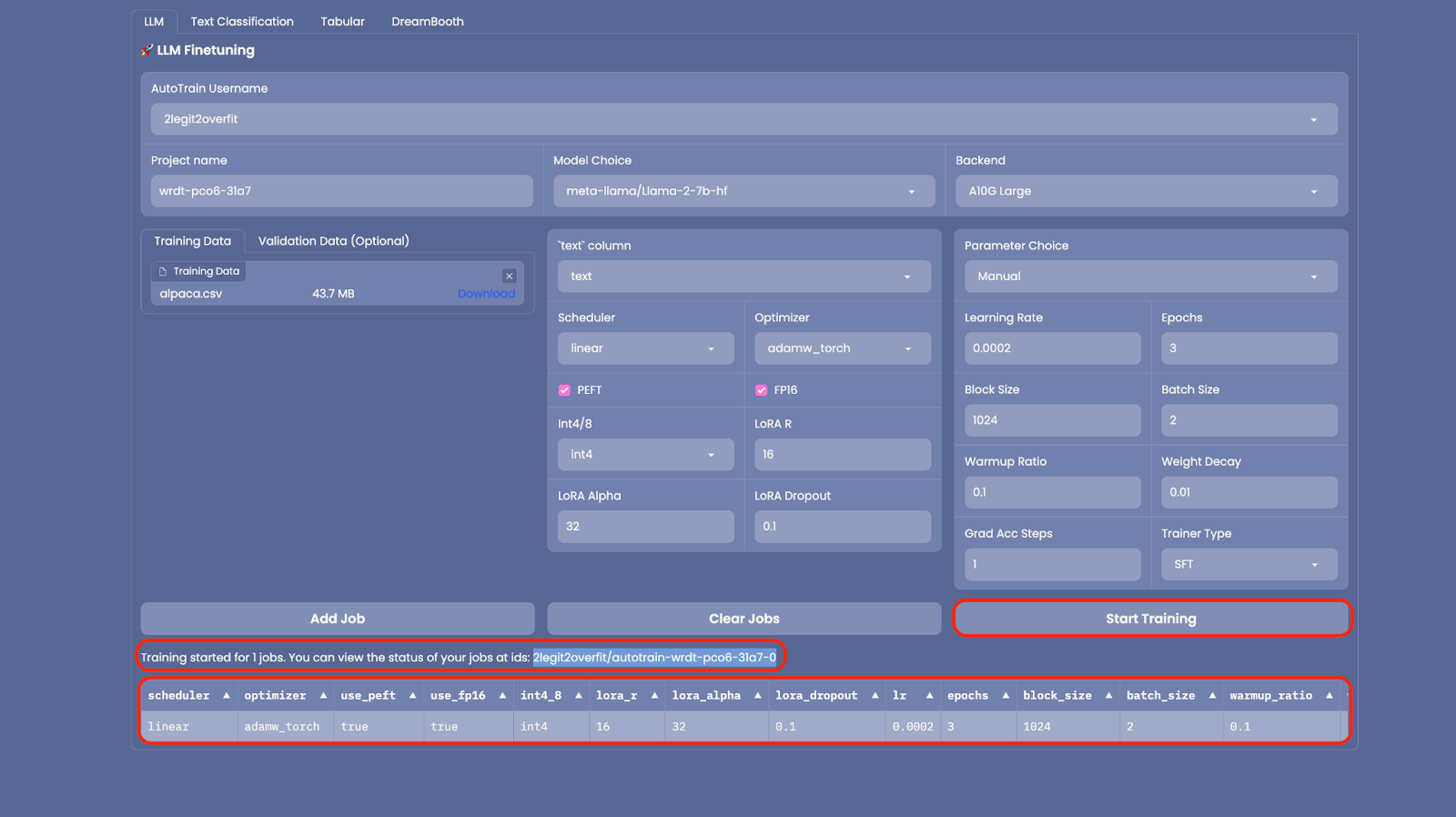 2.8 至此,一切都已设置完毕,点击 “Add Job” 将模型添加到训练队列中,然后点击 “Start Training”(注意: 如果你想用多组不同超参训练多个版本的模型,你可以添加多个作业同时运行)。
