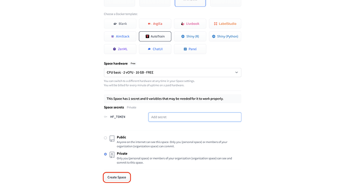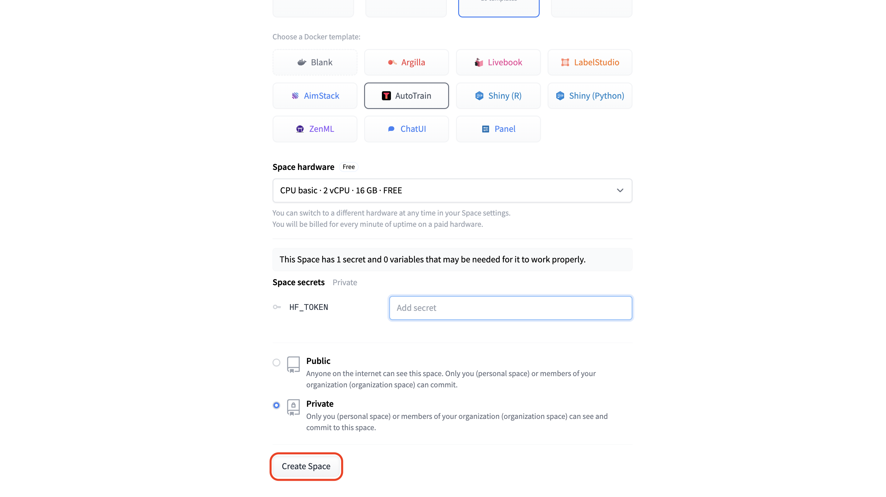 1.6 选择将 Space 设为“私有”还是“公开”,对于 AutoTrain Space 而言,建议设为私有,不影响你后面公开分享你的模型或聊天应用。
