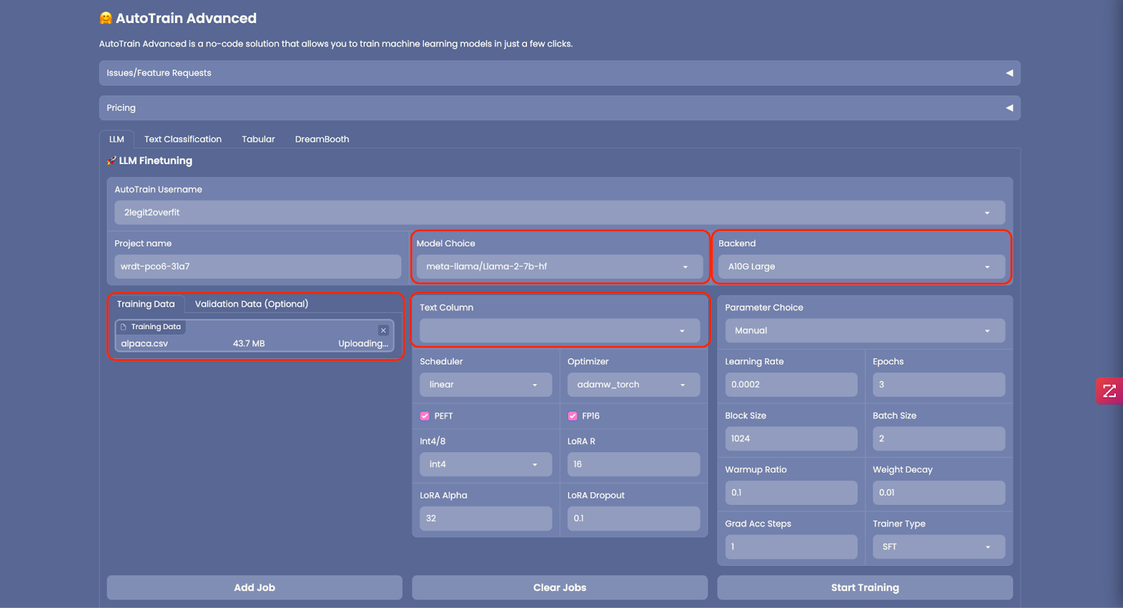 2.4 当然,要微调模型,你需要上传 “Training Data”。执行此操作时,请确保数据集格式正确且文件格式为 CSV。你可在 此处 找到符合要求的格式的例子。如果你的数据有多列,请务必选择正确的 “Text Column” 以确保 AutoTrain 抽取正确的列作为训练数据。本教程将使用 Alpaca 指令微调数据集,你可在 此处 获取该数据集的更多信息。你还可以从 此处 直接下载 CSV 格式的文件。