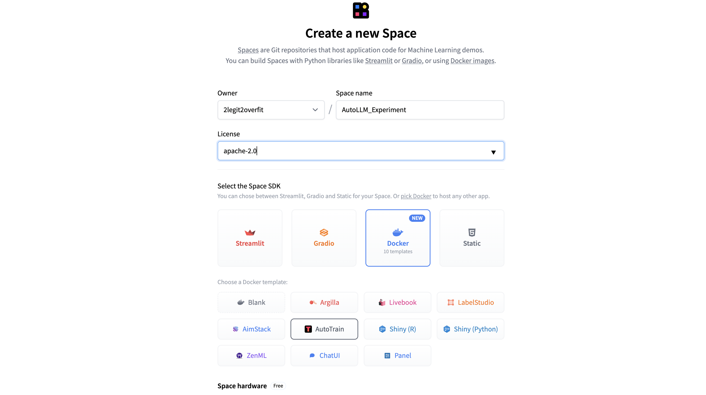 1.4 选择合适的 “Space hardware” 以运行应用。(注意: 对于 AutoTrain 应用,免费的 CPU 基本款就足够了,模型训练会使用单独的计算来完成,我们稍后会进行选择)。