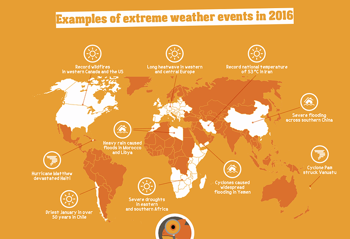 | 根据这张图表,干旱发生在什么地方? 2016 年干旱区域: 根据图表,2016 年发生干旱的地区有两个: * 东非和南非: 该地区经历了严重的干旱。 * 智利: 智利在 1 月份经历了 50 多年来最干燥的天气。这些地区在那段时间面临严重的水资源短缺问题。 |
