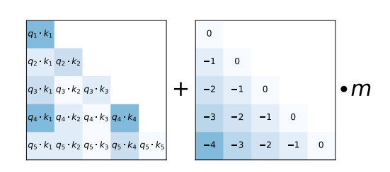另一个方案是 ALiBi , 它提出了一种更简单的相对位置编码方案。在计算 softmax 之前,\mathbf{QK}^T 矩阵的每个元素会减去被一个预定义系数 m 缩放后的对应两个向量间的相对距离。