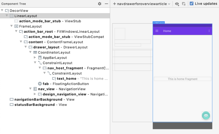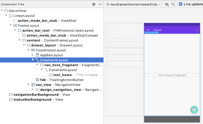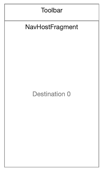 我们会发现 Toolbar 在顶部,其中包括了 ActionBar 菜单按钮。然后应用内容存在于下方,其中包括了 NavHostFragment,而 NavHostFragment 包括了当前目的地的 UI。