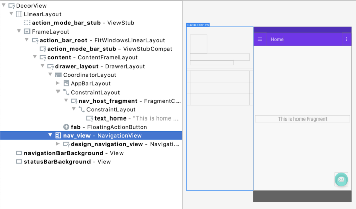 有一点需要注意的是 NavigationView 存在于 NavHostFragment 容器之外,它本身并不是一个目的地,而只是一个指定应用导航目的地的途径。另外值得关注的一点是,早在其被导航组件整合进导航系统之前,这个 API 已经存在并被使用了很长一段时间。