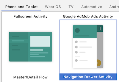 我发现,观察 UI 中的各个部分在包含层级中的相互关系对于理解它们如何一起工作十分有帮助。为了查看这个部分,让我们来使用 Navigation Drawer Activity 模板创建另一个新工程。