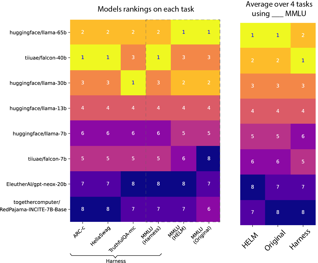 为了弄清楚得分差异的问题,我们决定在同一组模型上运行 MMLU 评测的三种不同实现,并根据得分对这些模型进行排名: