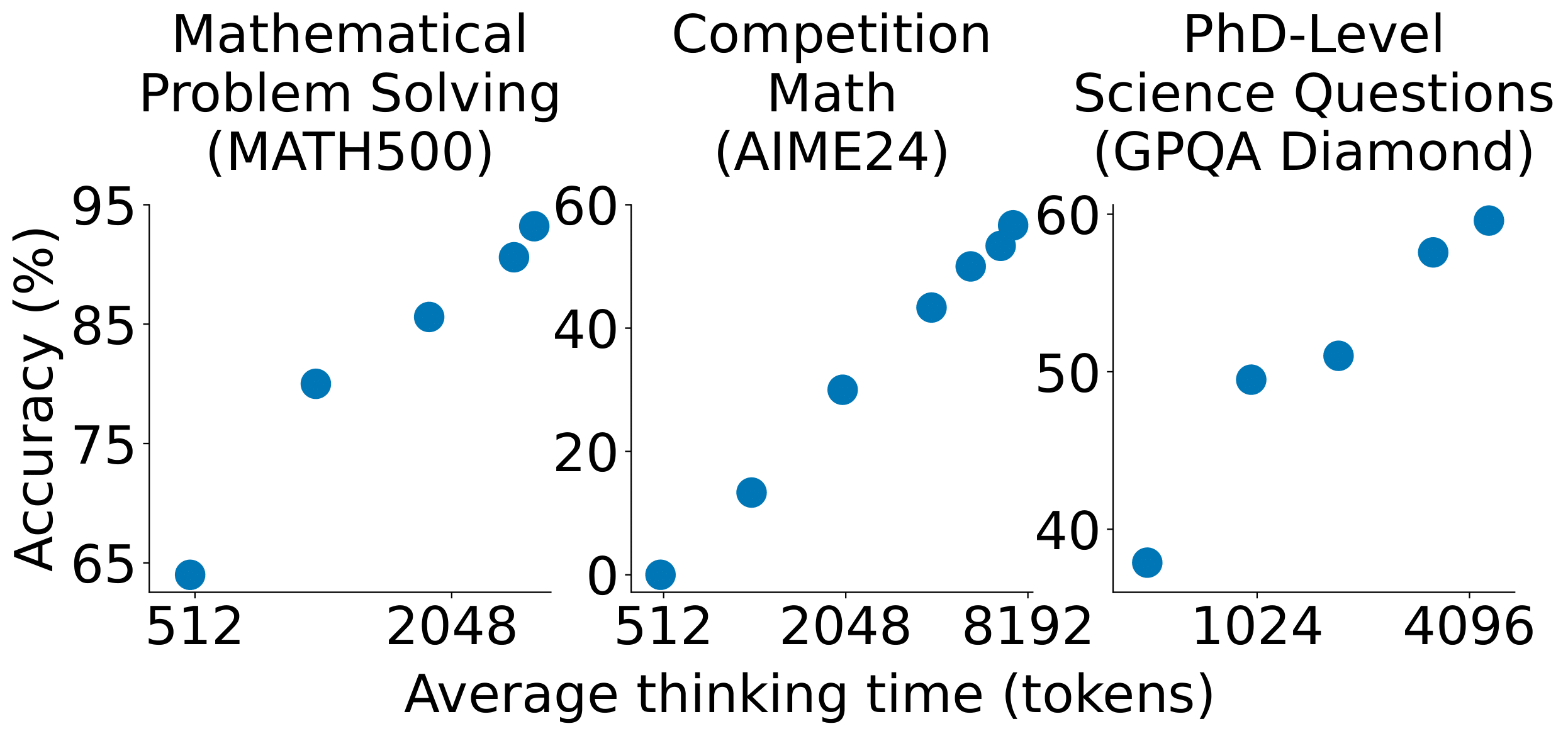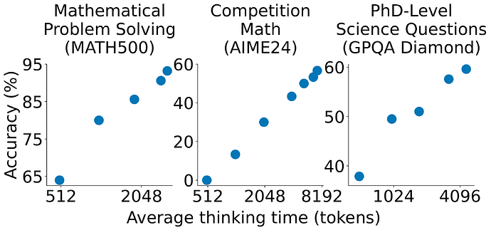 s1K 微调的 Qwen2.5-32B-Instruct 这么牛,一个关键是 预算强制。这招能在测试时调整推理时间,要么加个“Wait”让它多想,要么加个结束标记让它停。作者发现,模型有测试时扩展性: 多给点思考时间,数学测试的准确率就涨。