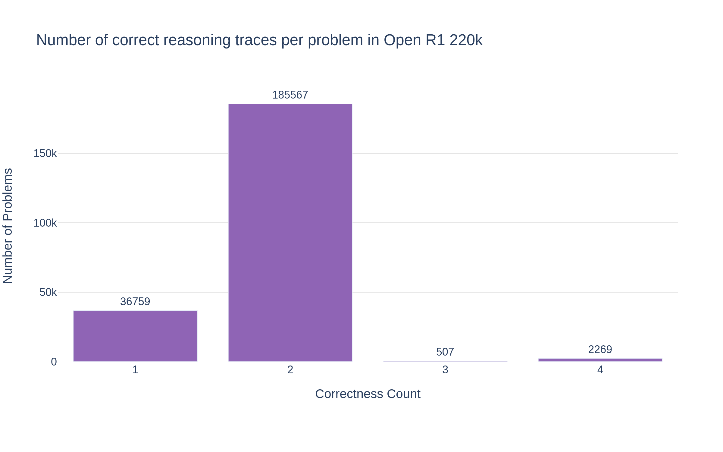 结合规则校验 (Math Verify) 和 LLM 判断,我们既保证了数据质量,又没牺牲规模。最终数据集有 22 万道题,推理过程都经过验证,是个训练推理模型的好资源。每道题多份答案也方便社区筛选更好的结果,或者根据 NuminaMath 的数据来源和题型再做调整。